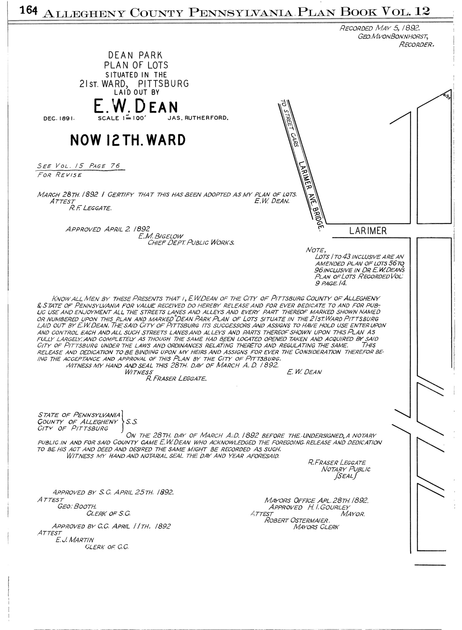 "Dean Park plan of lots: Situated in the 21st. Ward, Pittsburg: Laid out by E. W. Dean." Laid out Dec. 1891; recorded May 5, 1892, Plan Book 12, pp. 164–165. Allegheny County Recorder of Deeds 3780735. [view source] dean-park-plan