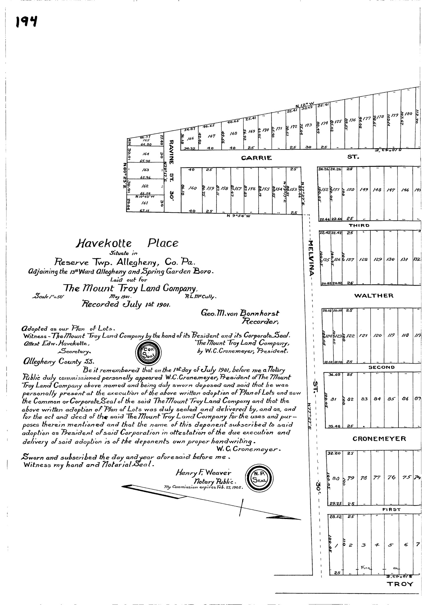 "Havekotte Place: Situate in Reserve Twp. Allegheny, Co. Pa.: Adjoining the 13th Ward Allegheny and Spring Garden Boro.: Laid out for the Mount Troy Land Company." Laid out May 1901; recorded July 1, 1901, Plan Book 18, pp. 194–195. Allegheny County Recorder of Deeds 3781730. [view source] havekotte-place-plan