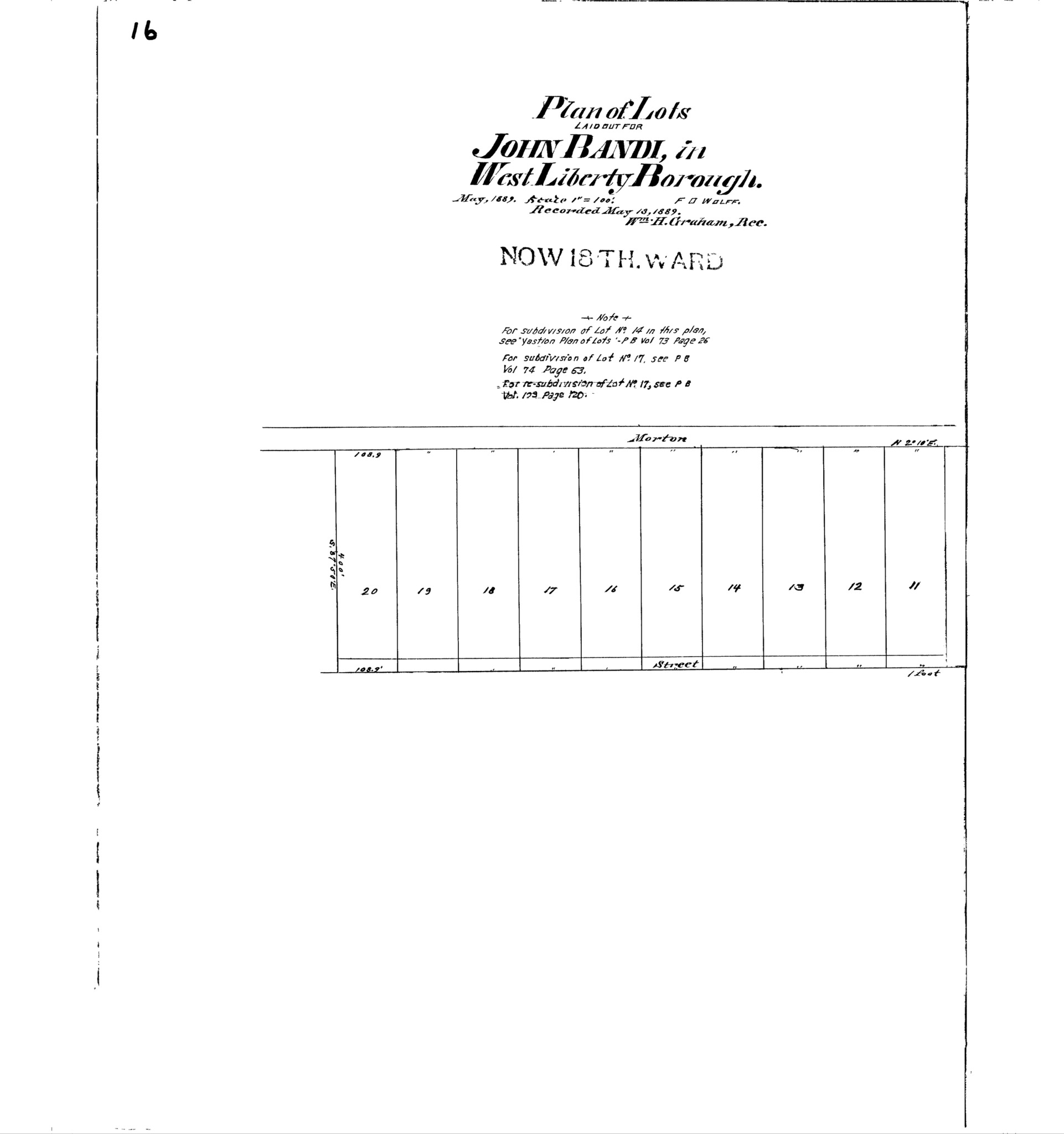 "Plan of lots laid out for John Bandi, in West Liberty Borough." Laid out May 1889; recorded May 13, 1889, Plan Book 9, pp. 16–17. Allegheny County Recorder of Deeds 3780130. [view source] john-bandi-plan