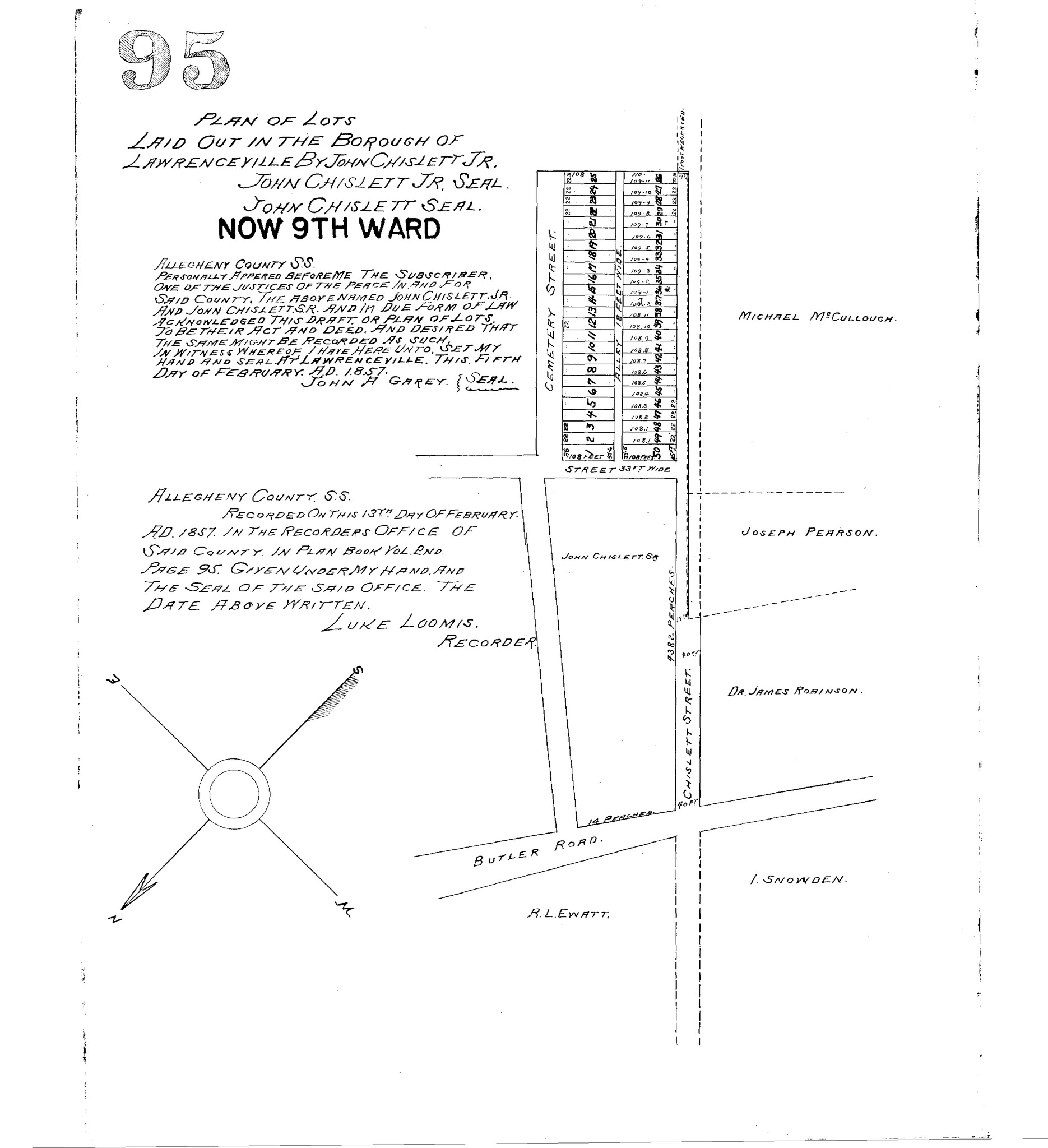 "Plan of lots laid out in the Borough of Lawrenceville by John Chislett Jr." Recorded Feb. 13, 1857, Plan Book 2, p. 95. Allegheny County Recorder of Deeds 3778372. [view source] john-chislett-jr-plan