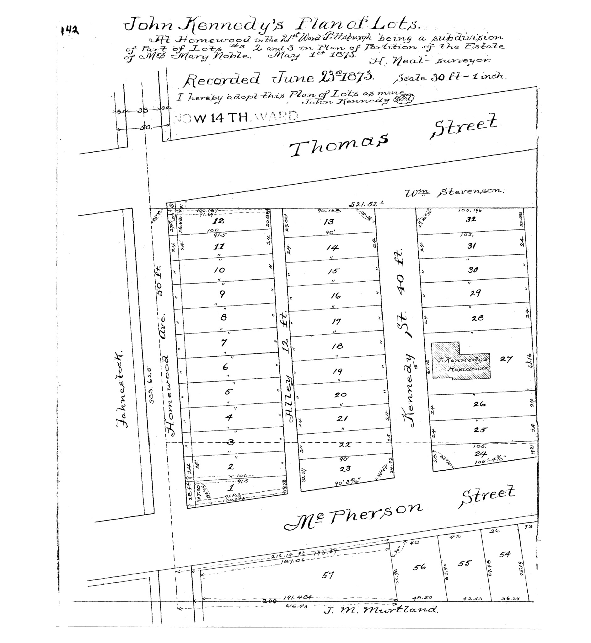 "John Kennedy's plan of lots: At Homewood in the 21st Ward Pittsburgh being a subdivision of part of lots #s 2 and 3 in plan of partition of the estate of Mrs. Mary Noble." Laid out May 1, 1873; recorded June 23, 1873, Plan Book 5, pp. 142–143. Allegheny County Recorder of Deeds 3779144. [view source] john-kennedy-plan