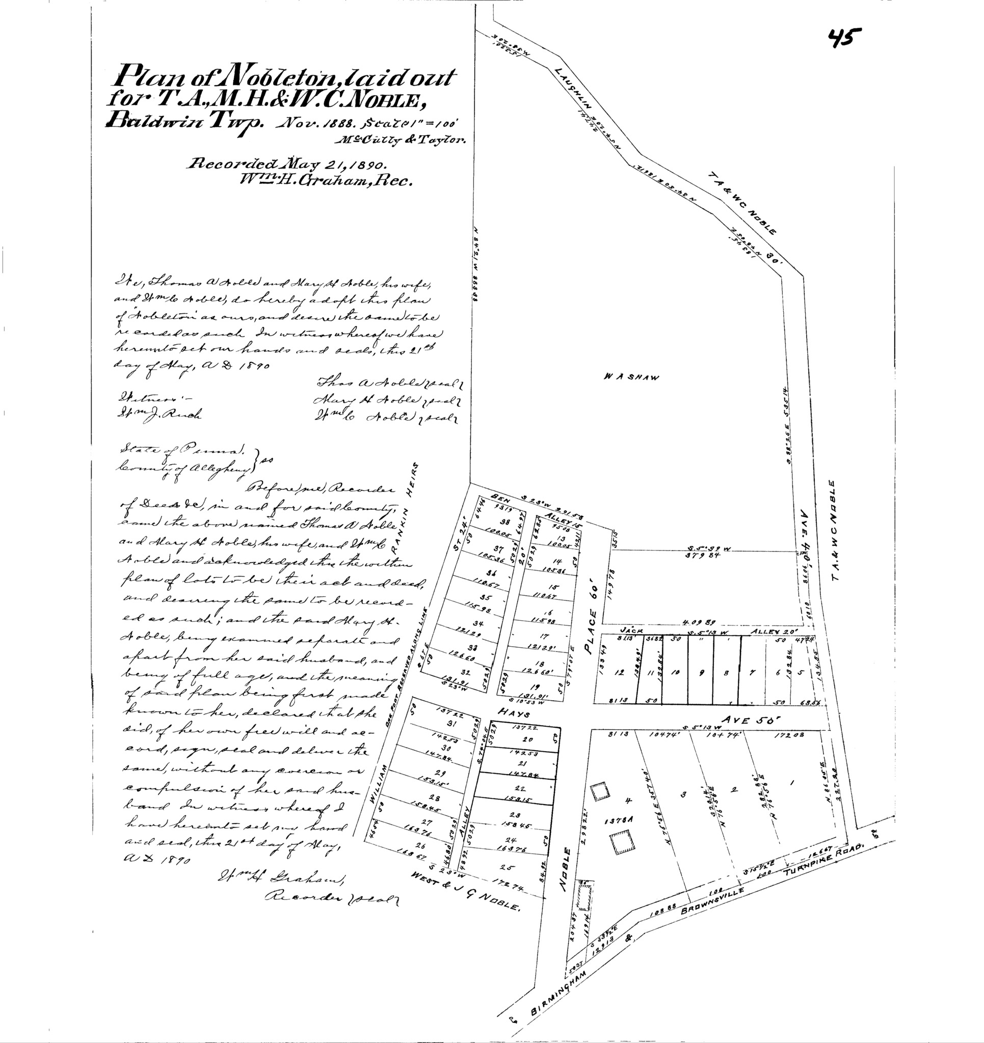 "Plan of Nobleton, laid out for T. A., M. H. & W. C. Noble, Baldwin Twp." Laid out Nov. 1888; recorded May 21, 1890, Plan Book 10, p. 45. Allegheny County Recorder of Deeds 3780325. [view source] nobleton-plan