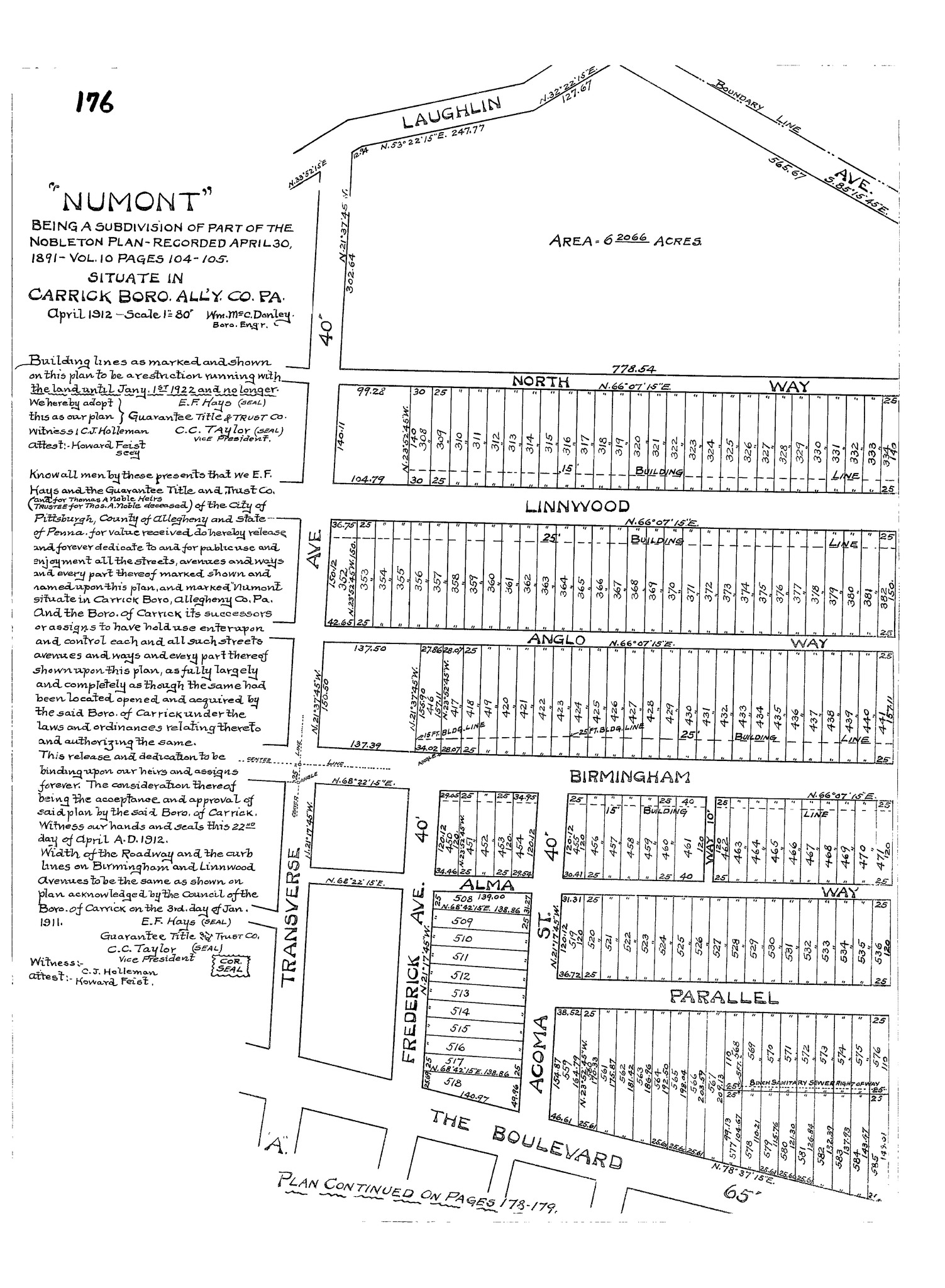 "'Numont': Being a subdivision of part of the Nobleton plan – recorded April 30, 1891 – vol. 10 pages 104–105: Situate in Carrick Boro. All'y. Co. Pa." Laid out Apr. 1912; recorded May 7, 1912, Plan Book 25, pp. 176–179. Allegheny County Recorder of Deeds 3782919. [view source] numont-plan