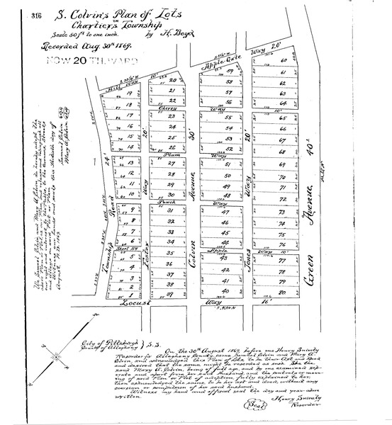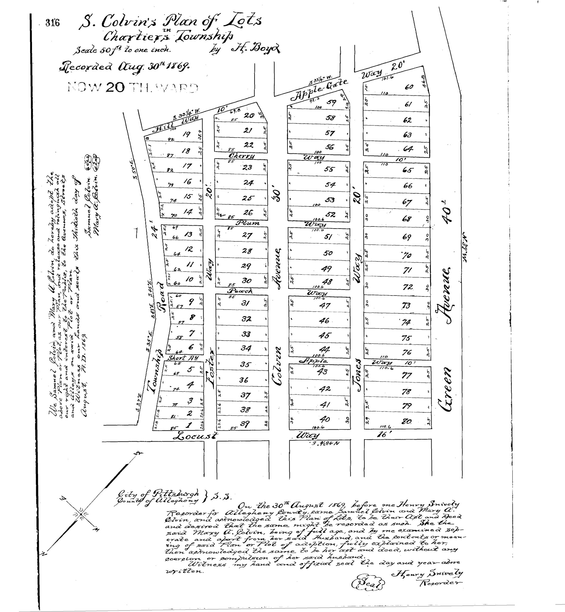 "S. Colvin's plan of lots in Chartiers Township." Recorded Aug. 30, 1869, Plan Book 3, p. 316. Allegheny County Recorder of Deeds 3778762. [view source] s-colvin-plan