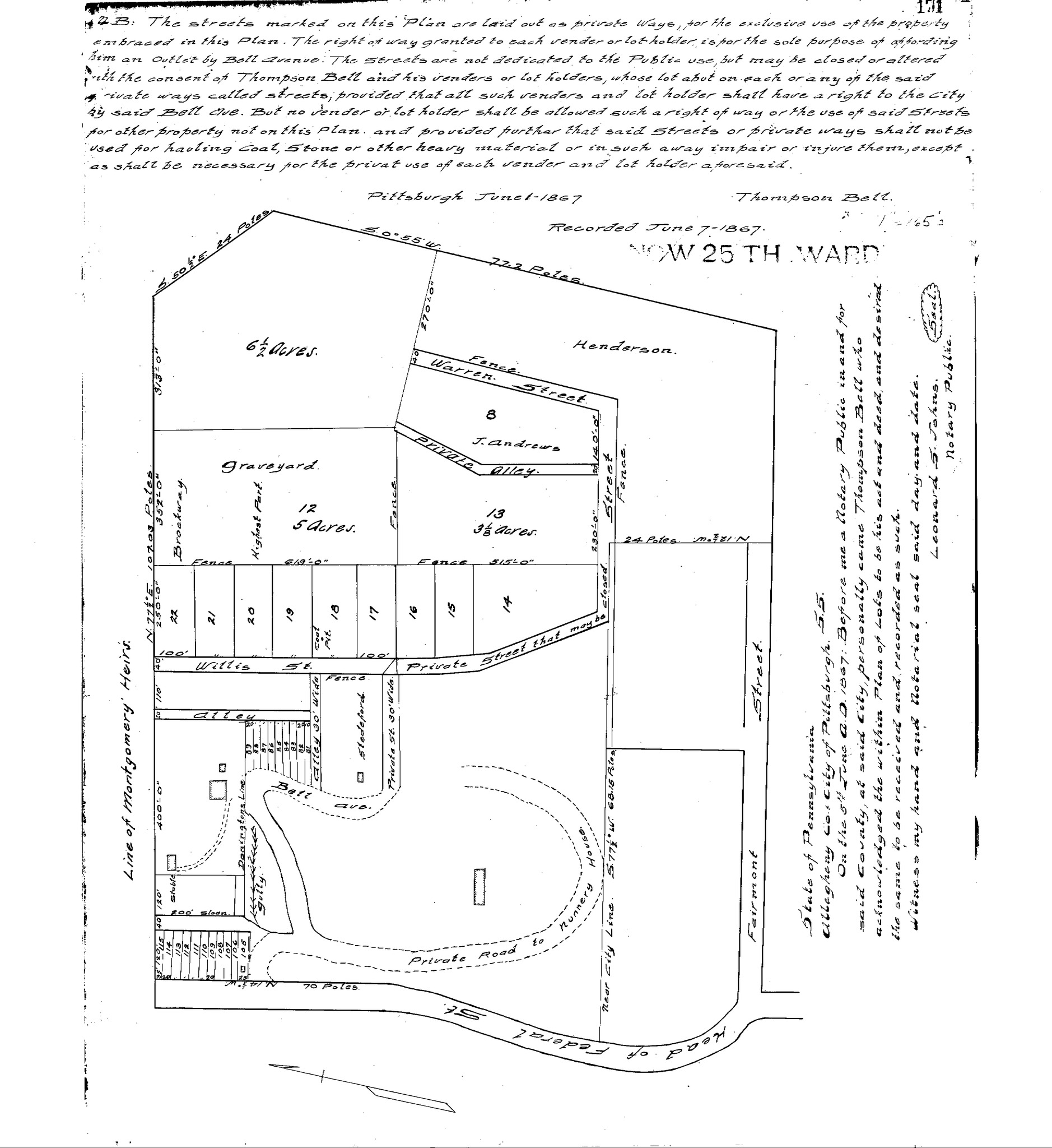 Plan of lots by Thompson Bell. Laid out June 1, 1867; recorded June 7, 1867, Plan Book 3, p. 171. Allegheny County Recorder of Deeds 3778607. [view source] thompson-bell-fineview-plan