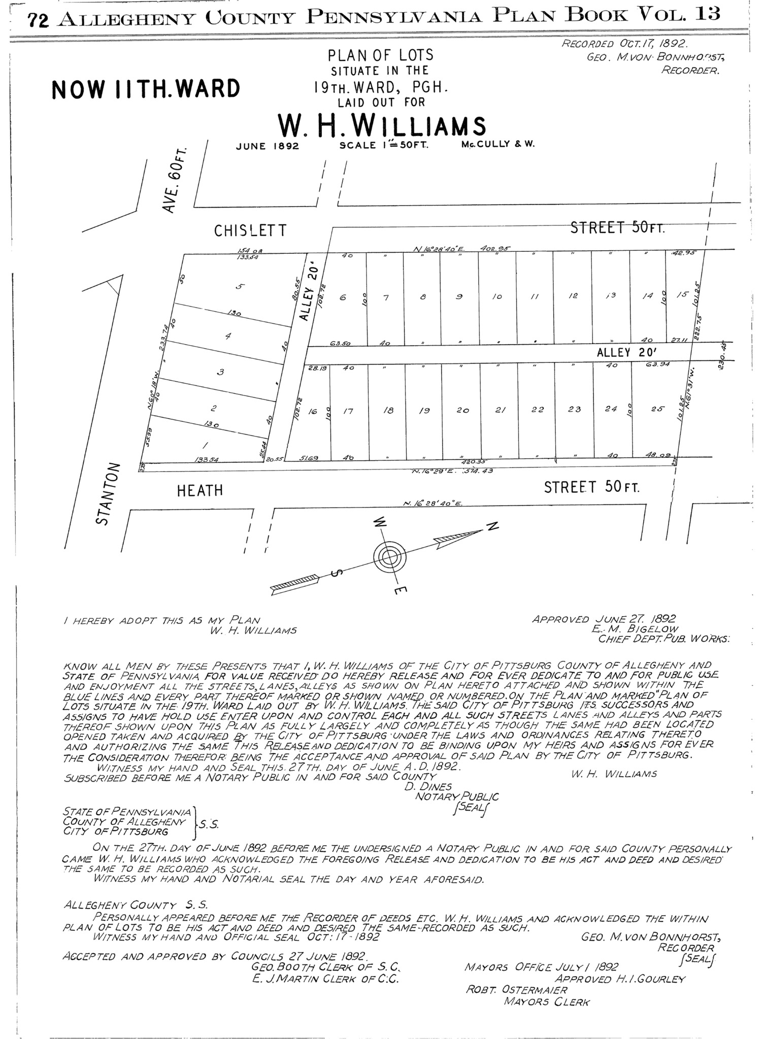 "Plan of lots situate in the 19th. Ward, Pgh. laid out for W. H. Williams." Laid out June 1892; recorded Oct. 17, 1892, Plan Book 13, p. 72. Allegheny County Recorder of Deeds 3780826. [view source] wh-williams-plan