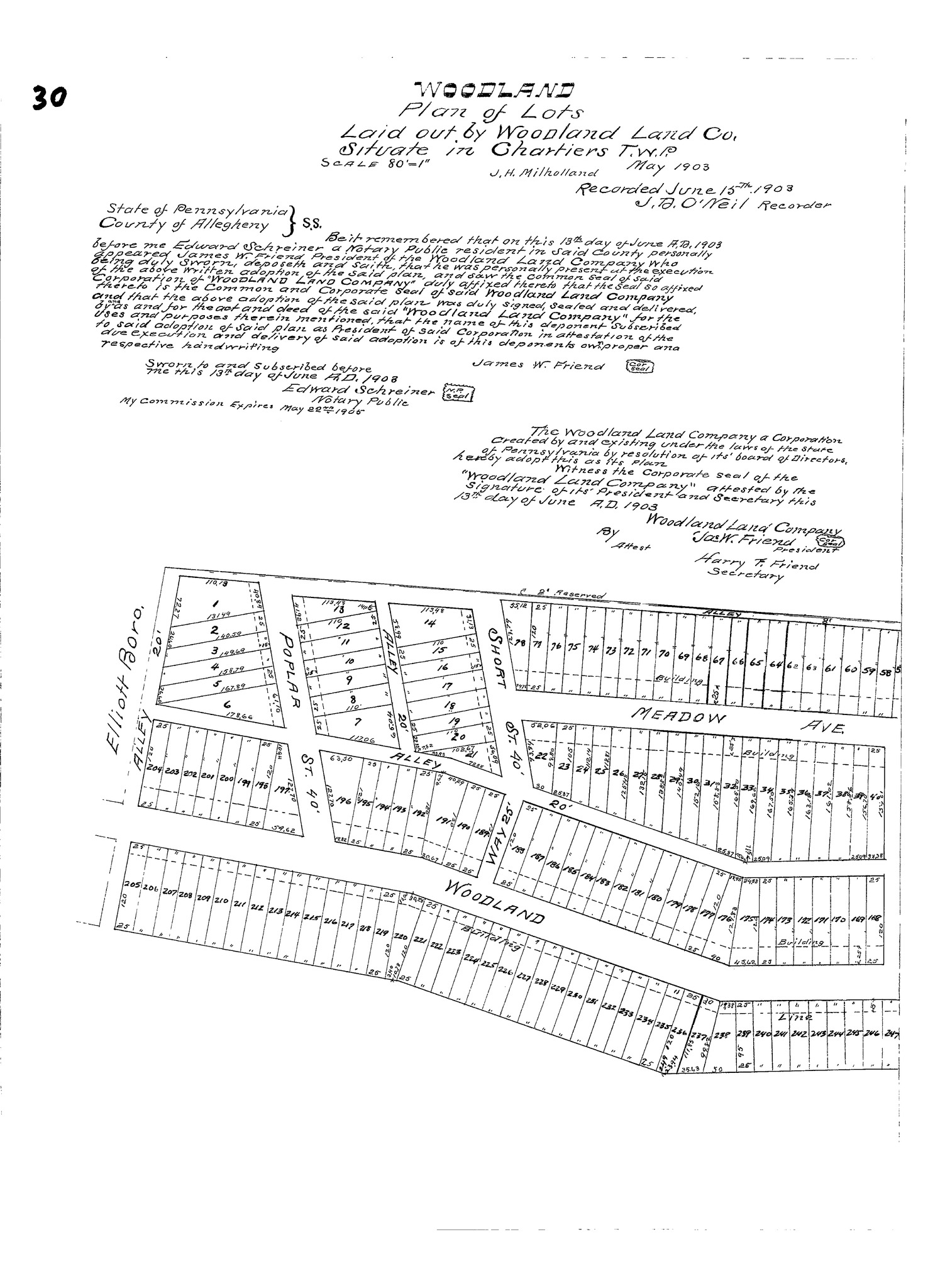 "Woodland plan of lots: Laid out by Woodland Land Co.: Situate in Chartiers T.w.p." Laid out May 1903; recorded June 15, 1903, Plan Book 21, pp. 30–32. Allegheny County Recorder of Deeds 3782029. [view source] woodland-plan
