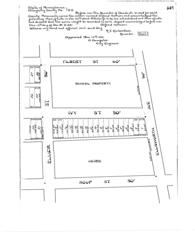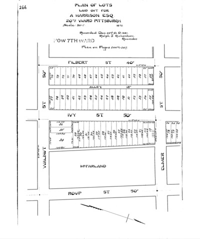 "Plan of lots laid out for A. Harrison Esq.: 20th Ward Pittsburgh." Laid out 1871; recorded Dec. 23, 1881, Plan Book 6, p. 266. Allegheny County Recorder of Deeds 3779493.