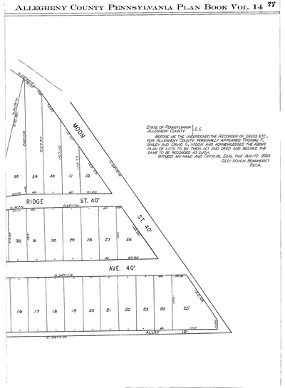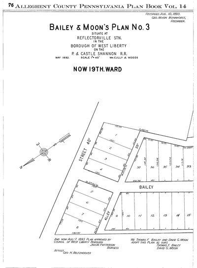 "Bailey & Moon's plan no. 3: Situate at Reflectorville Stn. in the Borough of West Liberty on the P. & Castle Shannon R. R." Laid out May 1892; recorded Aug. 10, 1893, Plan Book 14, pp. 76–77. Allegheny County Recorder of Deeds 3780977.