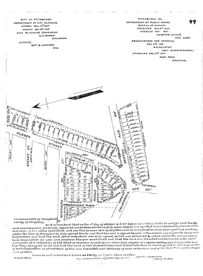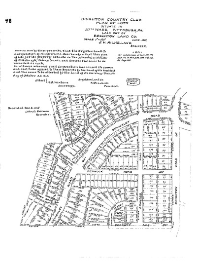 "Brighton Country Club plan of lots: Situate in 27th Ward, Pittsbugh [sic], Pa.: Laid out by Brighton Land Co." Laid out June 1915; recorded Dec. 8, 1915, Plan Book 27, pp. 48–49. Allegheny County Recorder of Deeds 3783147.