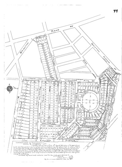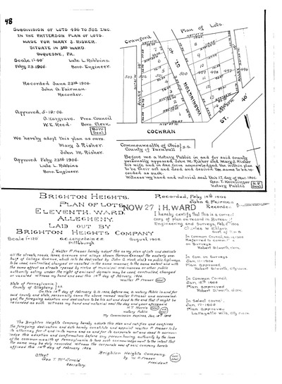 "Brighton Heights plan of lots: Eleventh Ward, Allegheny: Laid out by Brighton Heights Company." Laid out Aug. 1905; recorded Feb. 14, 1906, Plan Book 23, pp. 48–49. Allegheny County Recorder of Deeds 3782376.