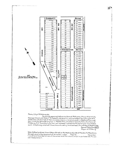 "Plan of a subdivision into town lots of lots nos. 1, 2, 3, 4, 5, 6, 7, 8, 9, 13, 14, 15, 16 & 17 in Bedford's plan and nos. 1, 2 and the stone quarry lot in Reed plan: Situated on Grant's Hill in the Manor of Pittsburg, Pitt Twp.: Surveyed and laid out for Messrs. George A. Cook & Robert S. Cassatt." Laid out Apr. 10, 1835; recorded May 14, 1835, Plan Book 1, p. 34. Allegheny County Recorder of Deeds 3778152.