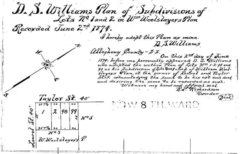 "D. S. Williams plan of subdivisions of lots № 1 and 2 in Wm. Woolslayers plan." Recorded June 2, 1874, Plan Book 3, p. 294. Allegheny County Recorder of Deeds 3779264, 3778746.