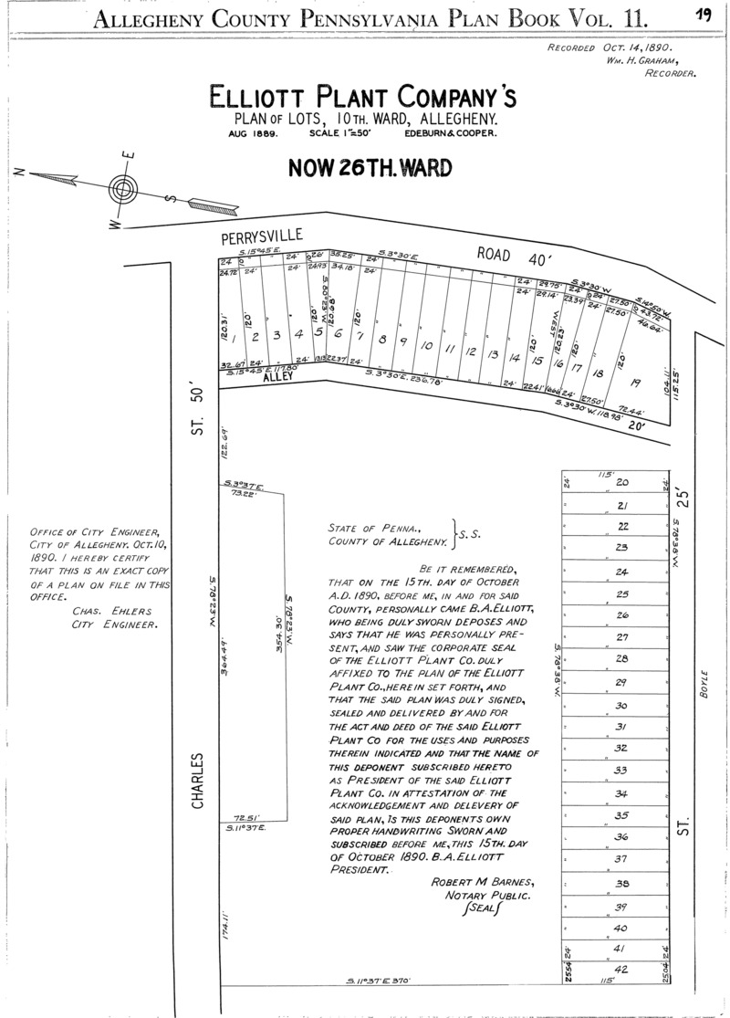 "Elliott Plant Company's plan of lots, 10th. Ward, Allegheny." Laid out Aug. 1889; recorded Oct. 14, 1890, Plan Book 11, p. 19. Allegheny County Recorder of Deeds 3780430.