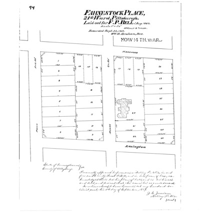 "Fahnestock Place, 21st Ward, Pittsburgh: Laid out for F. P. Bell." Laid out Aug. 1889; recorded Sept. 23, 1889, Plan Book 9, pp. 94–95. Allegheny County Recorder of Deeds 3780201.