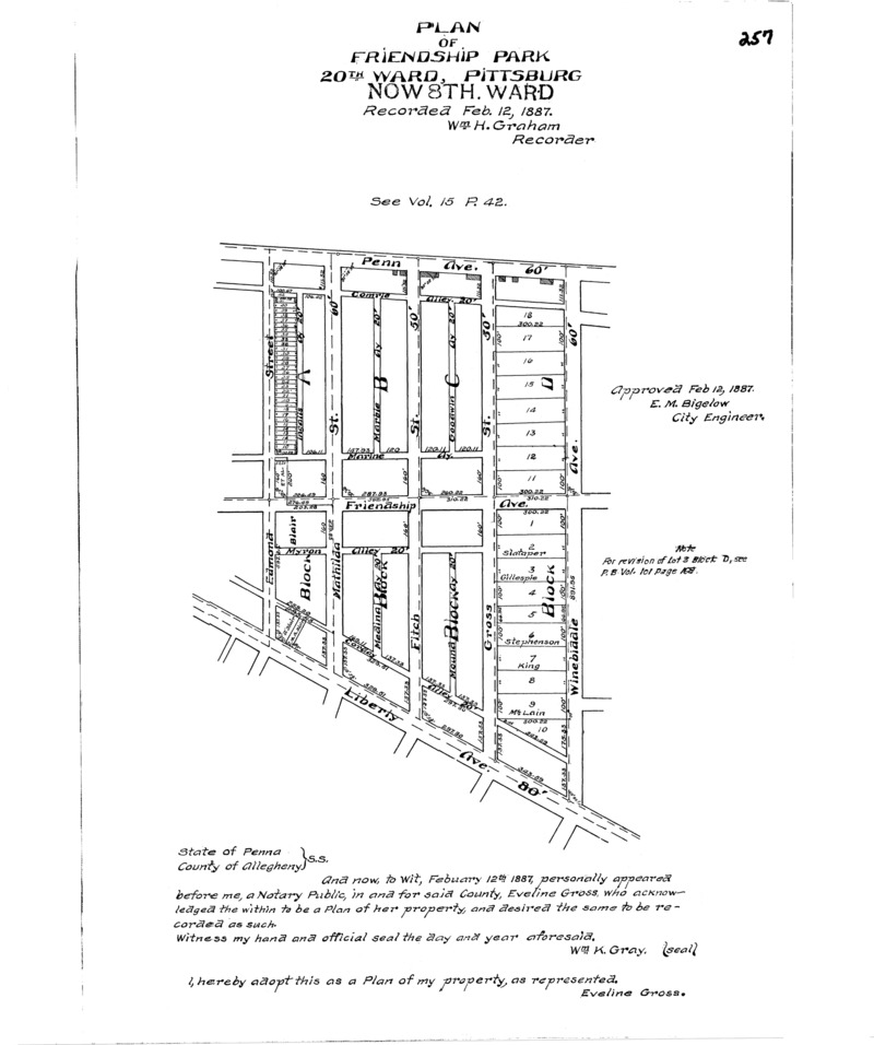 "Plan of Friendship Park: 20th Ward, Pittsburg." Recorded Feb. 12, 1887, Plan Book 7, p. 257. Allegheny County Recorder of Deeds 3779839.