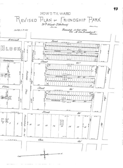 "Revised plan of Friendship Park: 20th Ward · Pittsburg." Laid out Apr. 1894; recorded Oct. 13, 1894, Plan Book 15, pp. 42–43. Allegheny County Recorder of Deeds 3781096.
