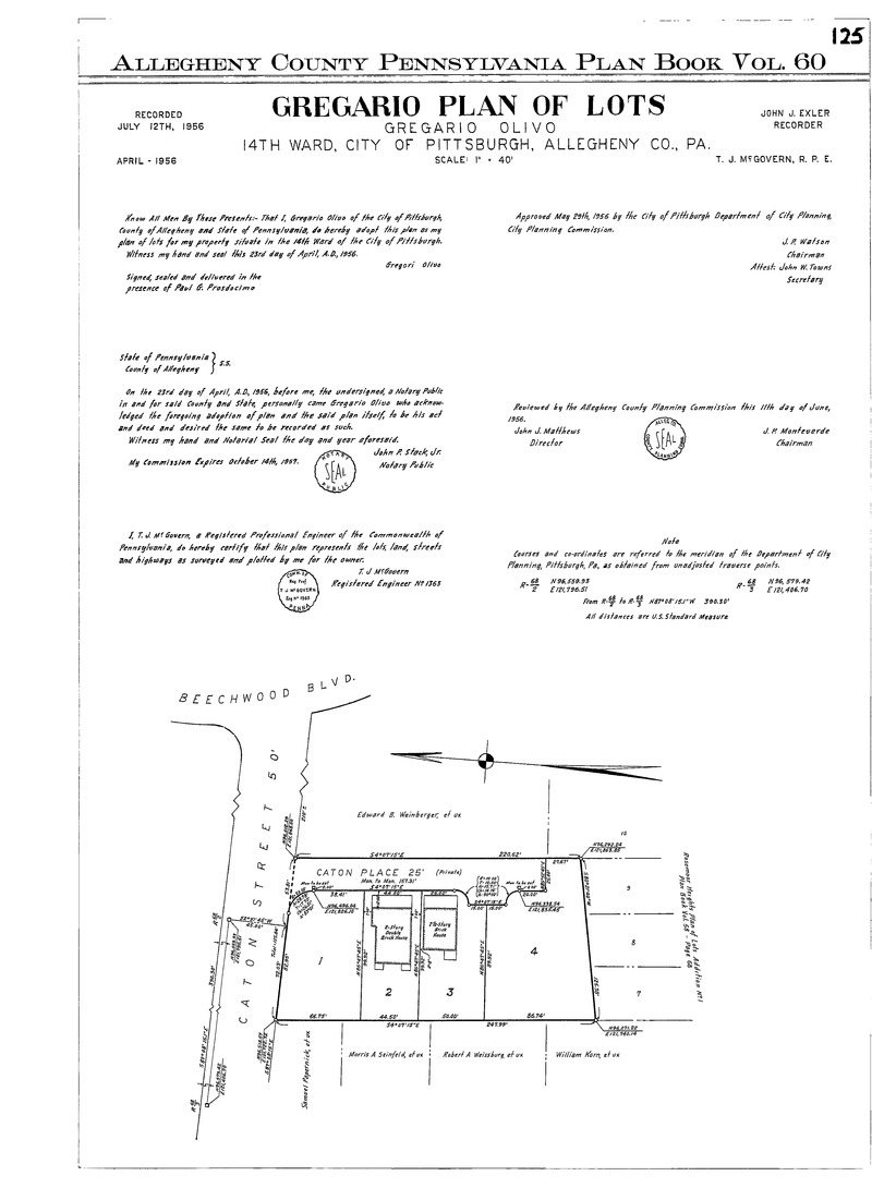 "Gregario plan of lots: Gregario Olivo: 14th Ward, City of Pittsburgh, Allegheny Co., Pa." Laid out Apr. 1956; recorded July 12, 1956, Plan Book 60, p. 125. Allegheny County Recorder of Deeds 3787030.