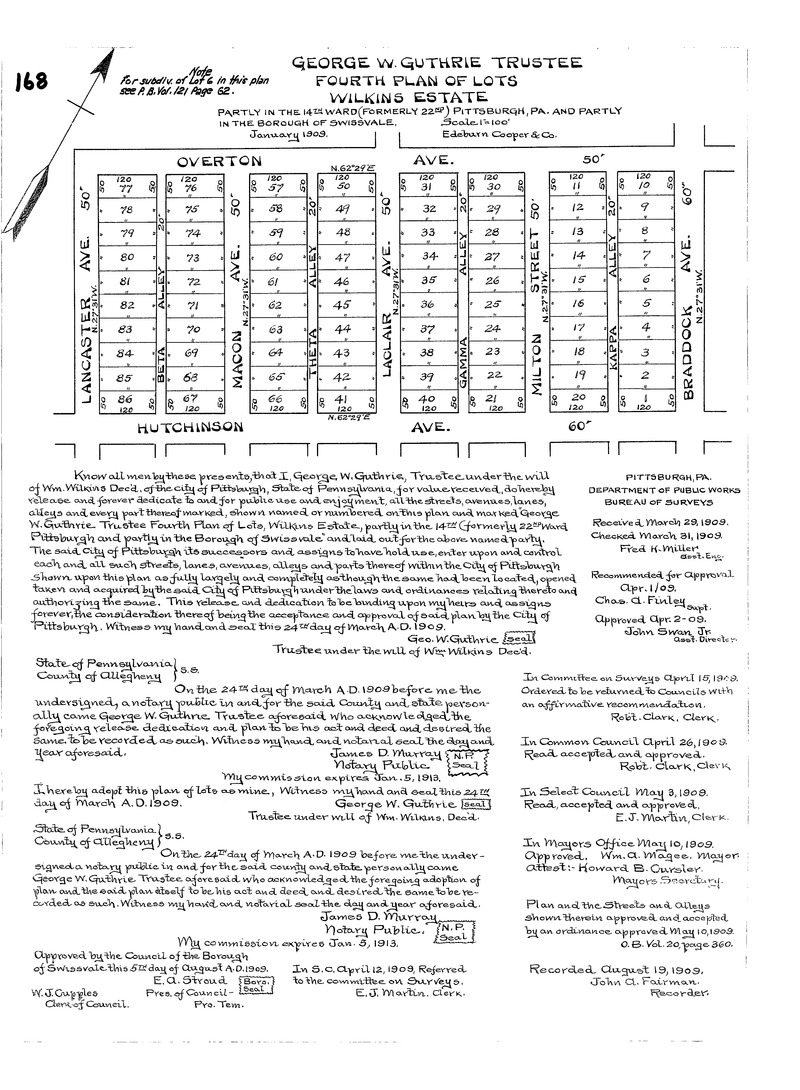 "George W. Guthrie trustee: Fourth plan of lots: Wilkins estate: Partly in the 14th Ward (formerly 22nd) Pittsburgh, Pa. and partly in the Borough of Swissvale." Laid out Jan. 1909; recorded Aug. 19, 1909, Plan Book 24, p. 168. Allegheny County Recorder of Deeds 3782733.