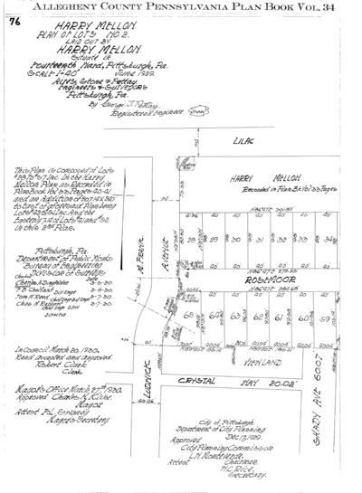 "Harry Mellon plan of lots no. 2: Laid out by Harry Mellon: Situate in Fourteenth Ward, Pittsburgh, Pa." Laid out June 1929; recorded Apr. 2, 1930, Plan Book 34, pp. 76–77. Allegheny County Recorder of Deeds 3784111.