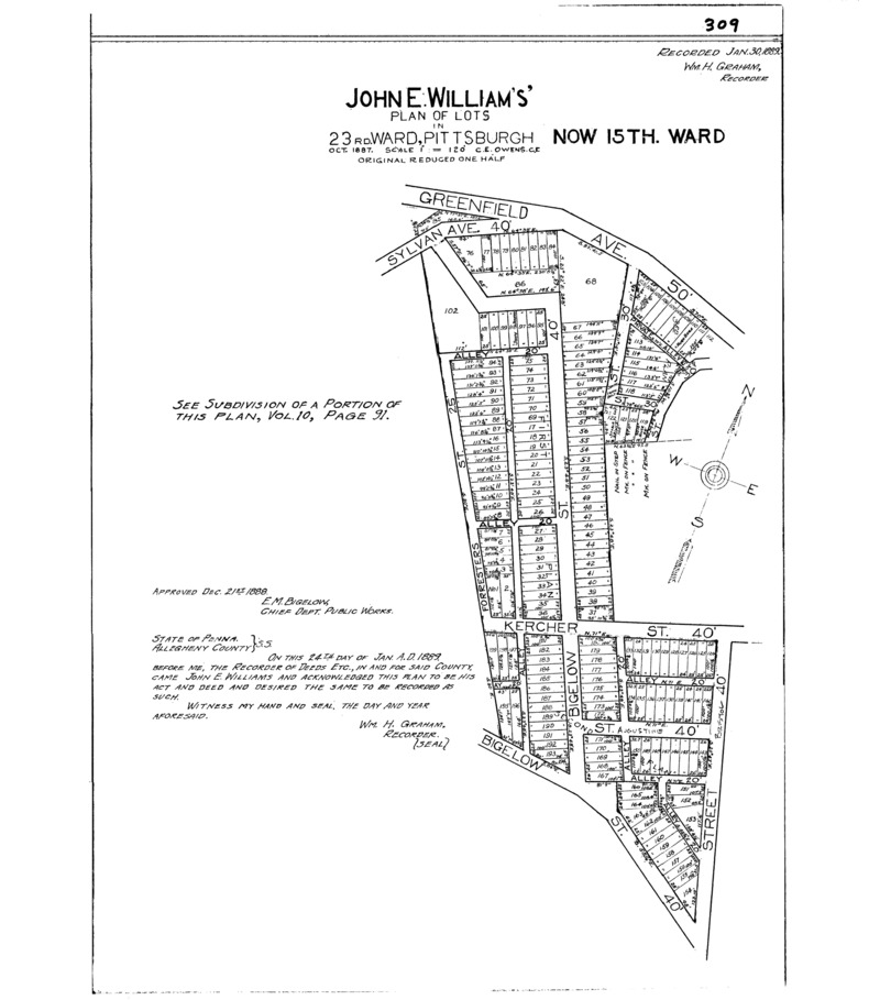 "John E. William's' [sic] plan of lots in 23rd. Ward, Pittsburgh." Laid out Oct. 1887; recorded Jan. 30, 1889, Plan Book 8, p. 309. Allegheny County Recorder of Deeds 3780083.