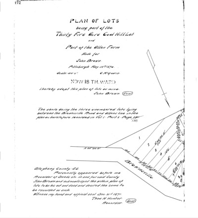 "Plan of lots: Being part of the thirty five acre Coal Hill lot and part of the Allen farm: Made for John Brown." Laid out May 12, 1870; recorded Dec. 21, 1871, Plan Book 4, pp. 172–173. Allegheny County Recorder of Deeds 3778934.