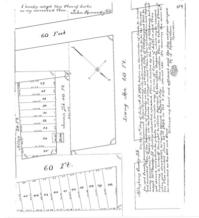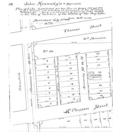 "John Kennedy's – revised plan of lots: Substituted for the plan on pages 142 and 143, of this volumn [sic]; and situated at Homewood in the 21st Ward Pittsburgh: Being a subdivision of part of lots no. 2 and 3 in the plan of partition of the estate of Mrs. Mary Noble." Recorded July 16, 1873, Plan Book 5, pp. 158–159. Allegheny County Recorder of Deeds 3779156.