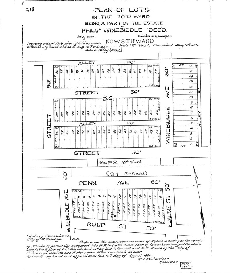 "Plan of lots in the 20th Ward: Being a part of the estate of Philip Winebiddle dec'd." Laid out July 1880; recorded Aug. 16, 1880, Plan Book 6, p. 218. Allegheny County Recorder of Deeds 3779446.