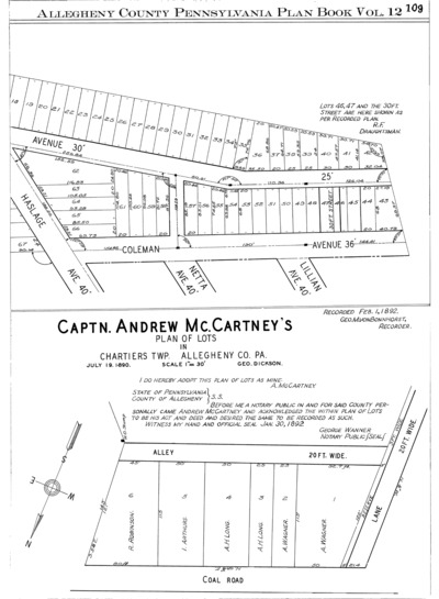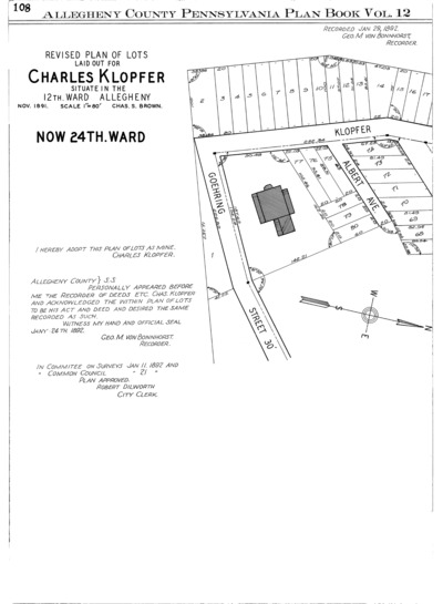 "Revised plan of lots laid out for Charles Klopfer: Situate in the 12th. Ward Allegheny." Laid out Nov. 1891; recorded Jan. 29, 1892, Plan Book 12, pp. 108–109. Allegheny County Recorder of Deeds 3780690.