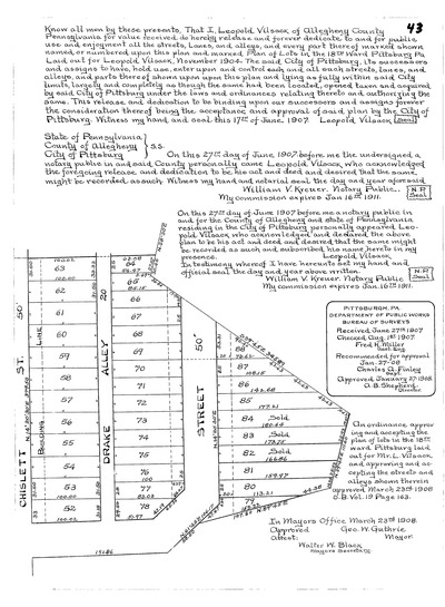 "Plan of lots in the 18th Ward Pittsburgh, Pa. laid out for Mr. L. Vilsack." Laid out Nov. 1904; recorded Apr. 1, 1908, Plan Book 24, pp. 42–43. Allegheny County Recorder of Deeds 3782620.