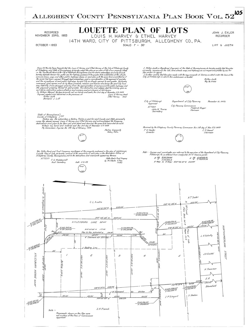 "Louette plan of lots: Louis H. Harvey & Ethel Harvey: 14th Ward, City of Pittsburgh, Allegheny Co., Pa." Laid out Oct. 1953; recorded Nov. 23, 1953, Plan Book 52, p. 105. Allegheny County Recorder of Deeds 3786128.