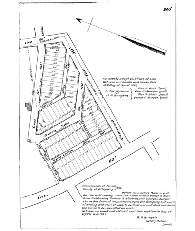 "Mansion House plan: Being a plan of the subdivision of lots nos. 39 & 40 in the plan of Upper Glenwood, 23rd Ward, Pittsburg." Laid out Mar. 1887; recorded June 23, 1887, Plan Book 7, pp. 304–305. Allegheny County Recorder of Deeds 3779872.
