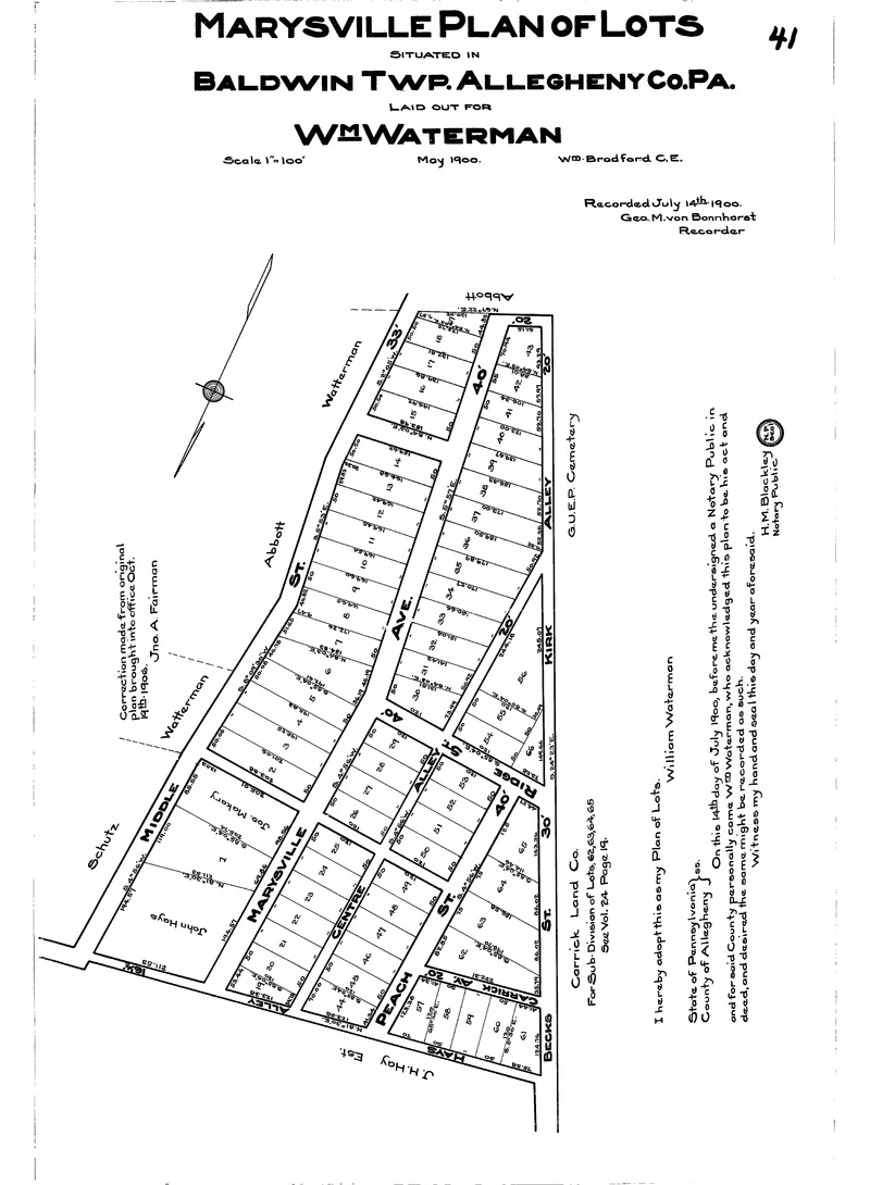 "Marysville plan of lots: Situated in Baldwin Twp. Allegheny Co. Pa.: Laid out for Wm. Waterman." Laid out May 1900; recorded July 14, 1900, Plan Book 18, p. 41. Allegheny County Recorder of Deeds 3781577.