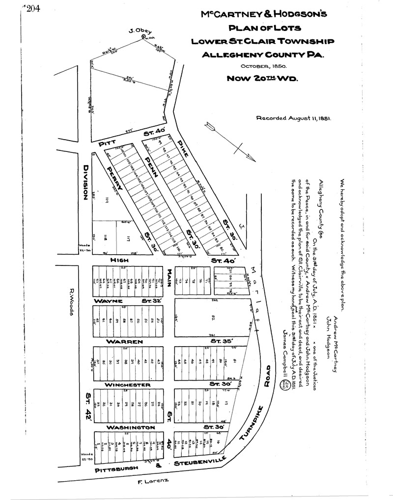 "McCartney & Hodgson's plan of lots, Lower St. Clair Township, Allegheny County Pa." Laid out Oct. 1850; recorded Aug. 11, 1851, Plan Book 1, p. 204. Allegheny County Recorder of Deeds 3778293.
