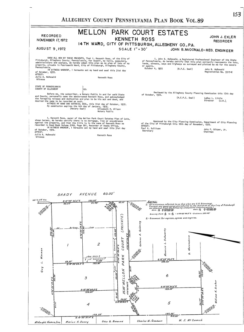 "Mellon Park Court Estates: Kenneth Ross: 14th Ward, City of Pittsburgh, Allegheny Co., Pa." Laid out Aug. 9, 1972; recorded Nov. 17, 1972, Plan Book 89, p. 153. Allegheny County Recorder of Deeds 3790537.