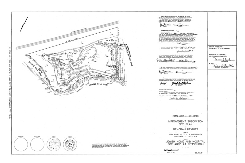 "Improvement subdivision site plan for Menorah Heights: Situate in 15th Ward – City of Pittsburgh, Allegheny County, PA: Made for Jewish Home and Hospital for Aged at Pittsburgh." Laid out July 1995; recorded Aug. 3, 1995, Plan Book 193, pp. 65–66. Allegheny County Recorder of Deeds 3502287.