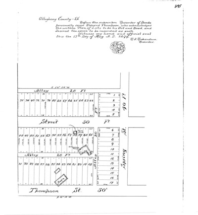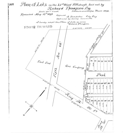 "Plan of lots in the 21st Ward Pittsburgh, laid out by Richard Thompson Esq." Laid out Mar. 1874; recorded May 13, 1874, Plan Book 5, pp. 294–295. Allegheny County Recorder of Deeds 3779256.