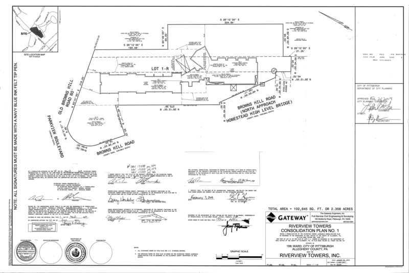 "Riverview Towers Consolidation Plan No. 1: Being a consolidation of the Riverview Towers Leasehold Consolidation Plan as recorded in the Department of Real Estate of the County of Allegheny, PA, in Plan Book volume 269, page 112 and part of lot 21 in the plan of lots T. J. Ingram as recorded in the Department of Real Estate of the County of Allegheny, PA, in Plan Book volume 34, pages 106 and 107: Situate in 15th Ward, City of Pittsburgh, Allegheny County, PA: Made for Riverview Towers, Inc." Laid out Jan. 22, 2019; recorded Apr. 19, 2019, Plan Book 300, p. 159. Allegheny County Recorder of Deeds 13975892.
