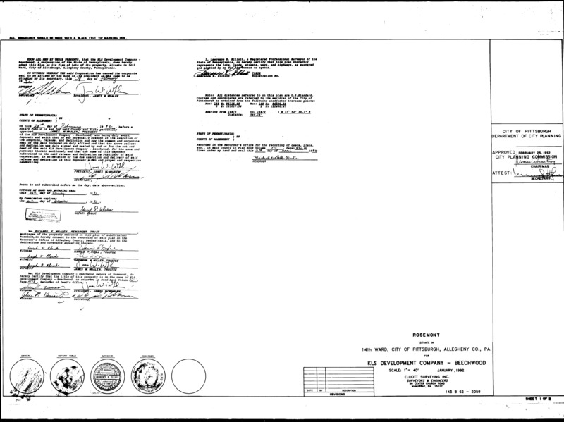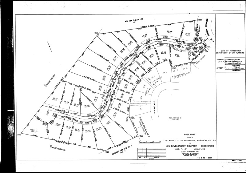 "Rosemont: Situate in 14th Ward, City of Pittsburgh, Allegheny Co., Pa.: For KLS Development Company – Beechwood." Laid out Jan. 1992; recorded Apr. 7, 1992, Plan Book 175, pp. 83–86. Allegheny County Recorder of Deeds 3500607.