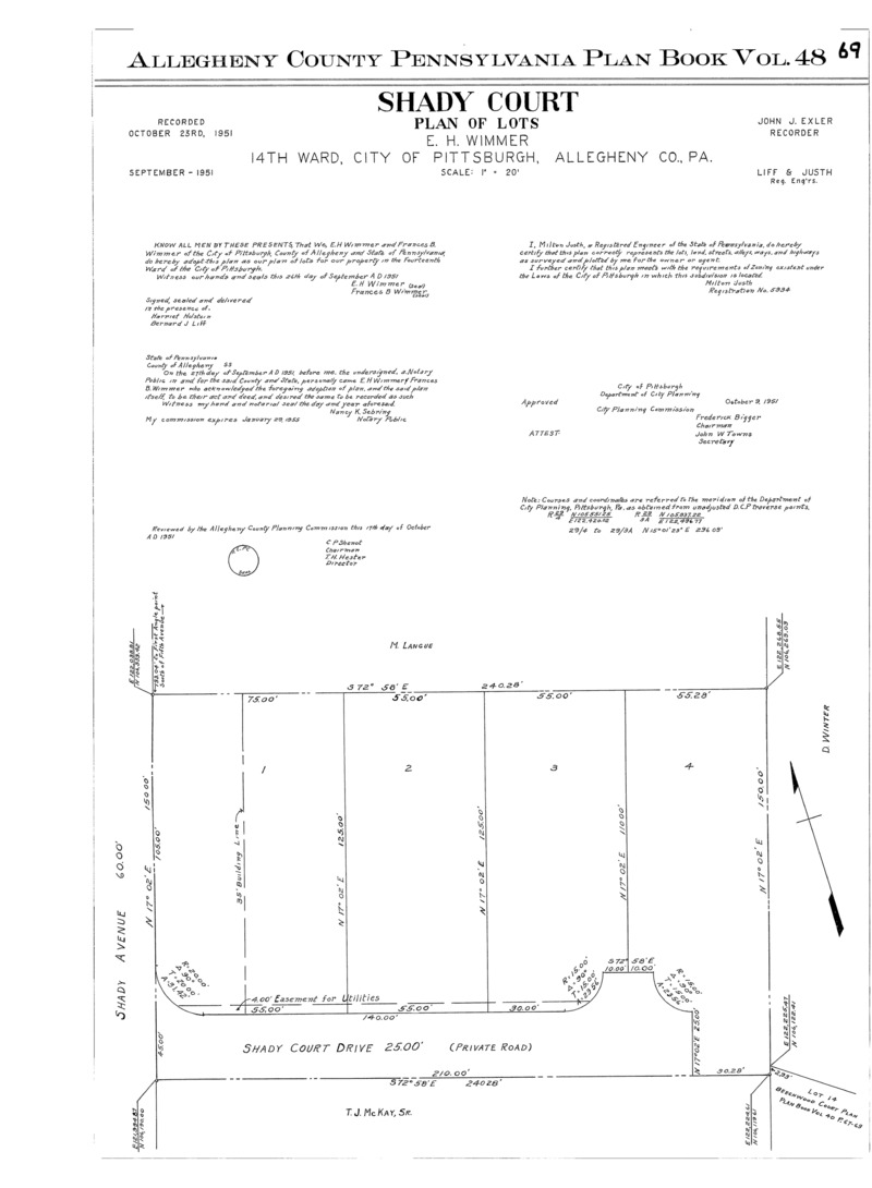 "Shady Court plan of lots: E. H. Wimmer: 14th Ward, City of Pittsburgh, Allegheny Co., Pa." Laid out Sept. 1951; recorded Oct. 23, 1951, Plan Book 48, p. 69. Allegheny County Recorder of Deeds 3785603.