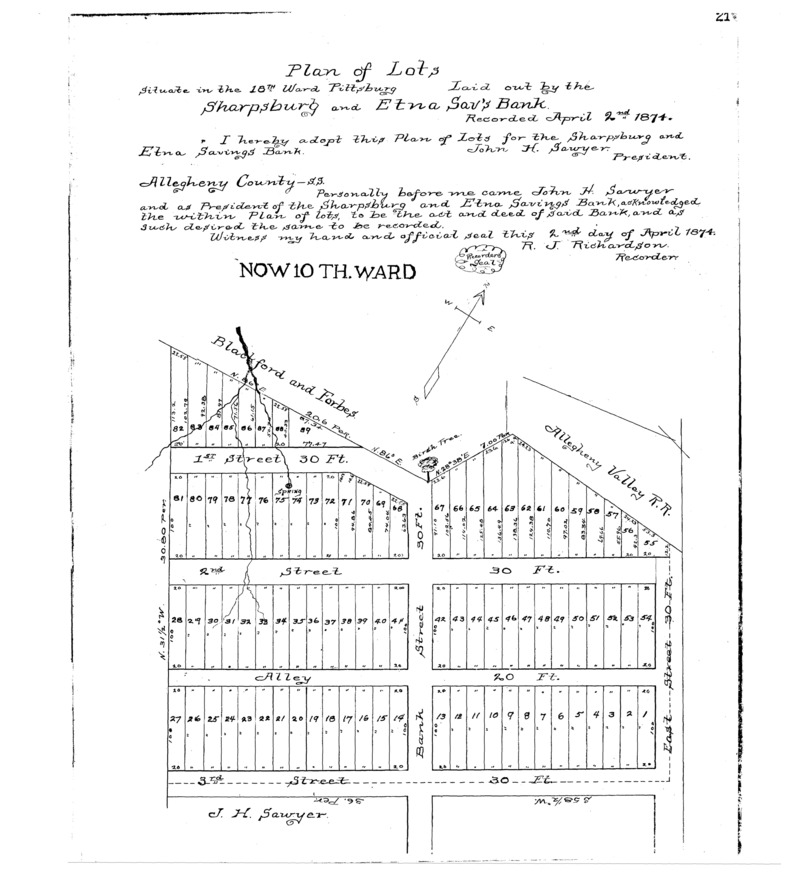 "Plan of lots situate in the 18th Ward Pittsburg: Laid out by the Sharpsburg and Etna Sav's Bank." Recorded Apr. 2, 1874, Plan Book 5, p. 21. Allegheny County Recorder of Deeds 3779235.