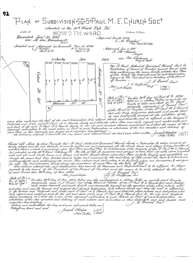 "Plan of subdivision of the property of the St. Paul M. E. Church Soc'y. situated in the 16th Ward Pgh Pa." Recorded Jan. 10, 1895, Plan Book 15, p. 72. Allegheny County Recorder of Deeds 3781115.