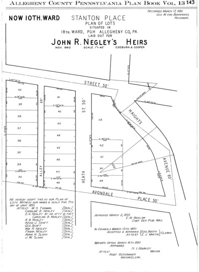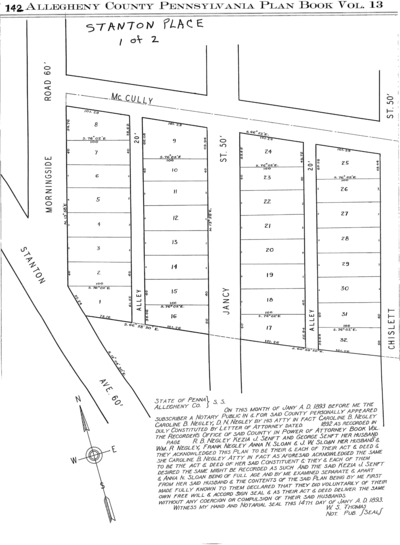 "Stanton Place: Plan of lots situated in 18th. Ward, Pgh Allegheny Co., Pa.: Laid out for John R. Negley's heirs." Laid out Nov. 1892; recorded Mar. 17, 1893, Plan Book 13, pp. 142–143. Allegheny County Recorder of Deeds 3780886.