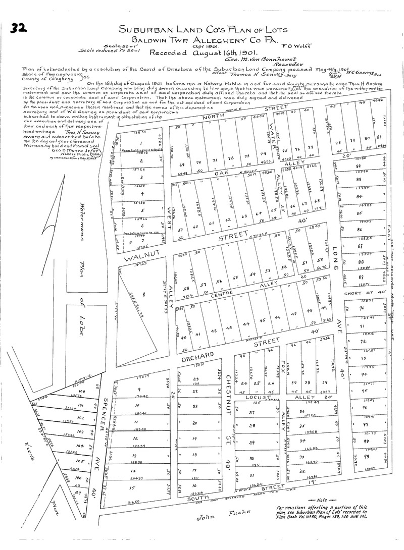 "Suburban Land Co's plan of lots: Baldwin Twp. Allegheny Co Pa." Laid out Apr. 1901; recorded Aug. 16, 1901, Plan Book 19, p. 32. Allegheny County Recorder of Deeds 3781747.