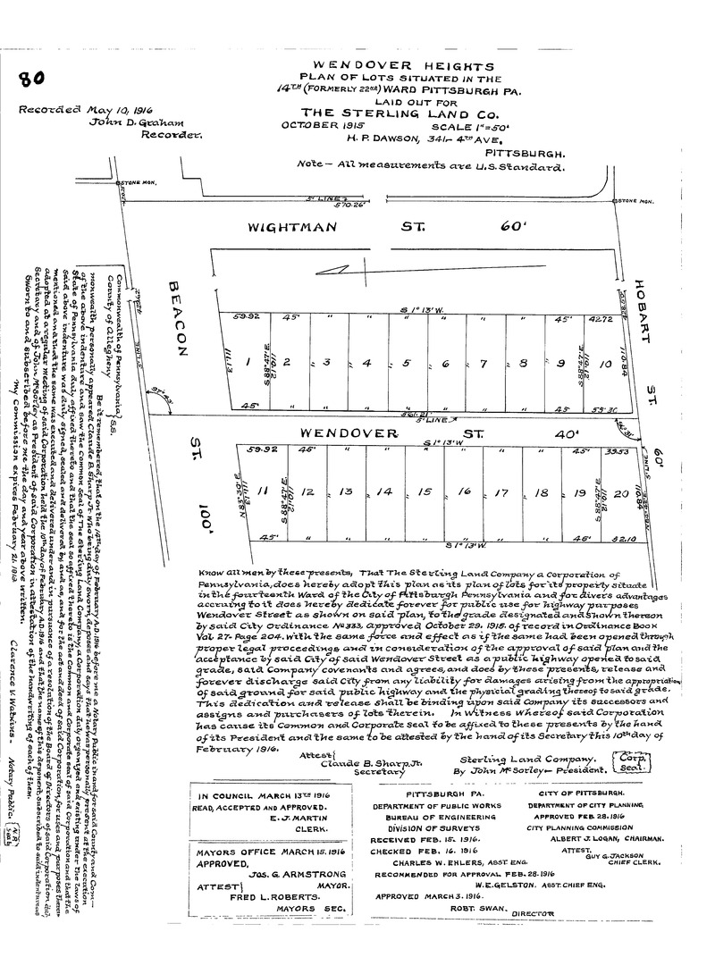 "Wendover Heights plan of lots situated in the 14th (formerly 22nd) Ward Pittsburgh Pa.: Laid out for the Sterling Land Co." Laid out Oct. 1915; recorded May 10, 1916, Plan Book 27, p. 80. Allegheny County Recorder of Deeds 3783174.