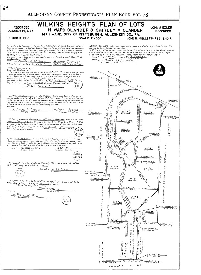 "Wilkins Heights plan of lots: H. Ward Olander & Shirley M. Olander: 14th Ward, City of Pittsburgh, Allegheny Co., Pa." Laid out Oct. 1965; recorded Oct. 14, 1965, Plan Book 78, p. 68. Allegheny County Recorder of Deeds 3788953.