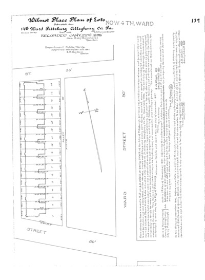 "Wilmot Place plan of lots: Situated in 14th Ward Pittsburg Allegheny Co. Pa." Laid out Dec. 1896; recorded Jan. 22, 1898, Plan Book 16, pp. 138–139. Allegheny County Recorder of Deeds 3781324.