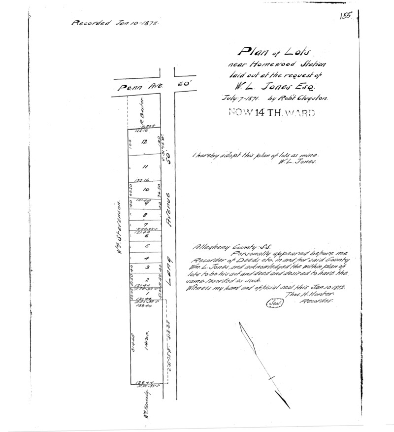 "Plan of lots near Homewood Station laid out at the request of W. L. Jones Esq." Laid out July 7, 1871; recorded Jan. 10, 1872, Plan Book 4, p. 155. Allegheny County Recorder of Deeds 3778939.
