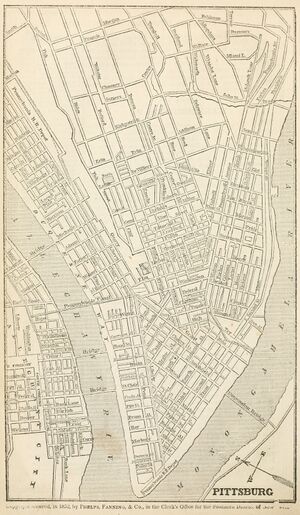 R. E. M'Gowan. Map of Pittsburgh & Vicinity: Designating the portion destroyed by fire, April 10, 1845. J. W. Cook, Pittsburgh, 1845. https://commons.wikimedia.org/wiki/File:Pittsburgh_map_1845.jpg. Published in the front matter of J. Heron Foster, A Full Account of the Great Fire at Pittsburgh, on the Tenth Day of April, 1845: With the Individual Losses, and Contributions for Relief, J. W. Cook, Pittsburgh, 1845 (Internet Archive fullaccountofgre00fost) and of O. Ormsby Gregg, Isaac Gregg, and Moses F. Eaton, Pittsburgh, Her Advantageous Position and Great Resources, as a Manufacturing and Commercial City, Embraced in a Notice of Sale of Real Estate, Johnson & Stockton, Pittsburgh, 1845 (Google Books nrJs-DDEN1sC; Historic Pittsburgh 00afu7810m). [view source] mcgowin-1845